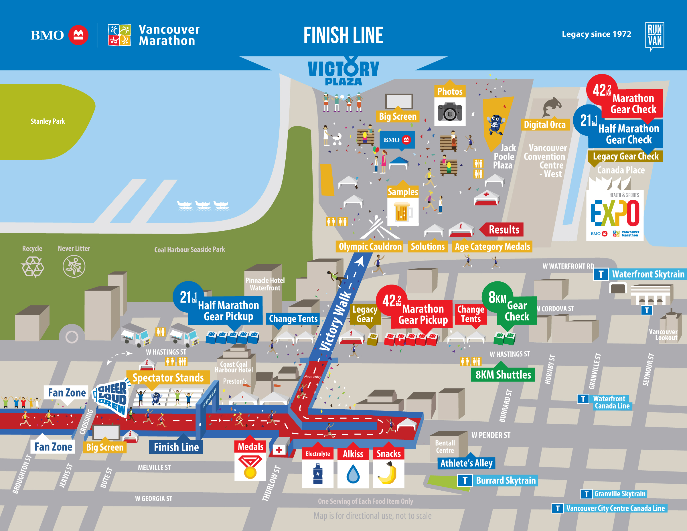 Near the Finish Line, spectators may find entertainment, food sampling, and souvenirs, at the downtown Street Festival and new Victory Plaza located at Jack Poole Plaza.